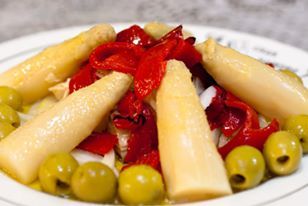 Yemas de espárragos aliñadas con aceite de oliva virgen cubiertas con jamón de Teruel π€€Button